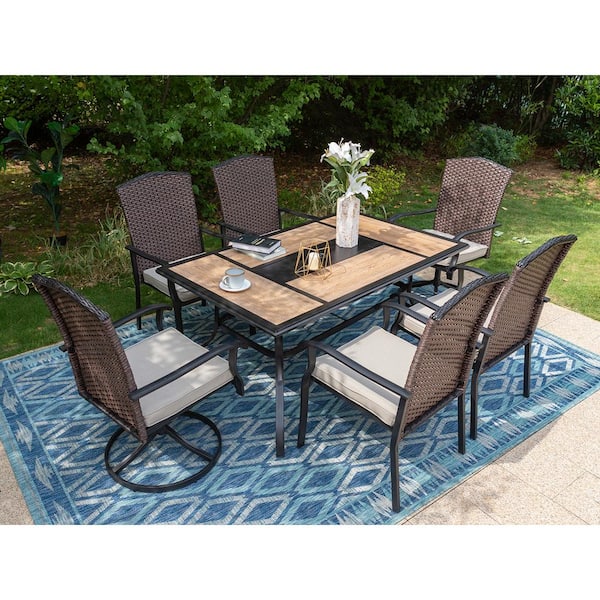 Black 7-Piece Metal Patio Outdoor Dining Set with Geometric Rectangle Table and Rattan Chairs with Beige Cushion