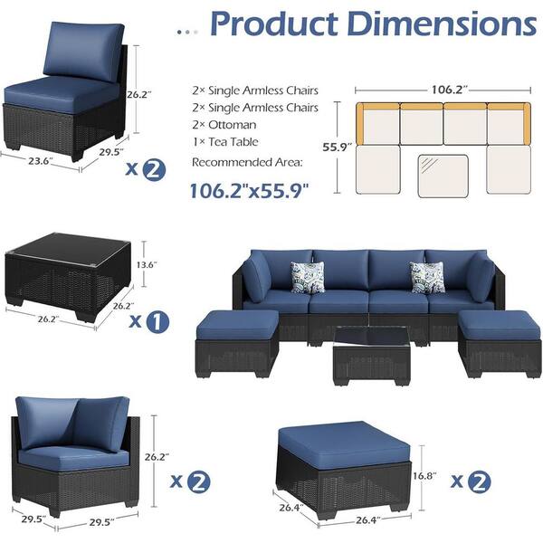 Black 7-Piece Wicker Outdoor Sectional Set, Patio Conversation Set with Navy Cushions, Ottomans and Side Table for Deck