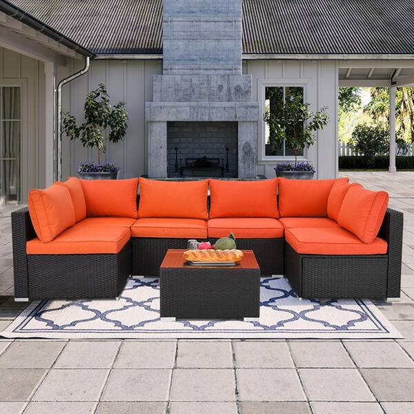 Black 7-Pieces PE Rattan Wicker Outdoor Patio Garden Sectional Set with Coffee Table, Orange Cushions and Steel