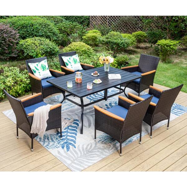 Black 8-Piece Metal Patio Outdoor Dining Set with Slat Rectangle Table, Umbrella and Rattan Chairs with Blue Cushion