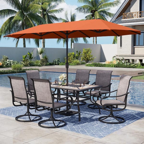 Black 8-Piece Metal Rectangle Patio Outdoor Dining Set with Geometric Table, Umbrella and Textilene Swivel Chairs