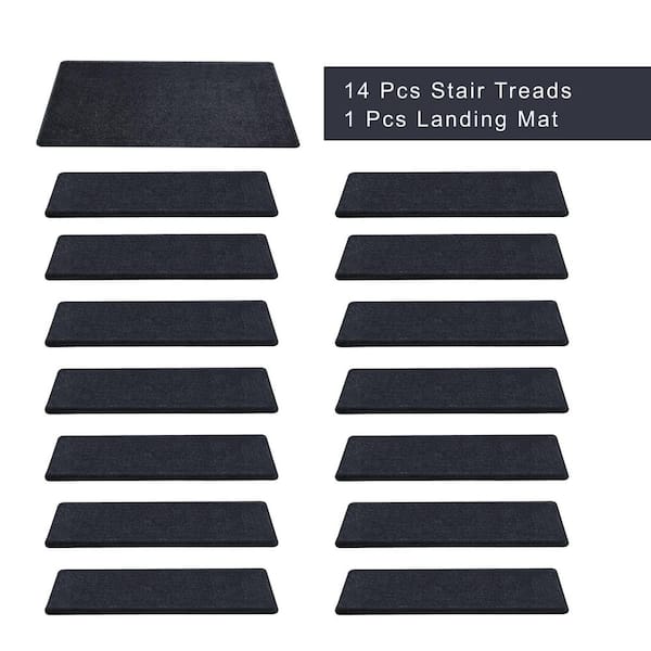 Black 9.5 in. x 30 in. x 1.2 in. Bullnose Polypropylene Non-slip Carpet Stair Tread Cover With Landing Mat (Set of 15)