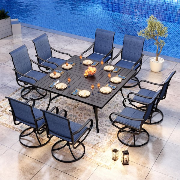 Black 9-Piece Metal Outdoor Patio Dining Set with Slat Extra-Large Square Table and Padded Blue Textilene Swivel Chairs