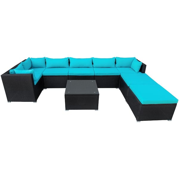 Black 9-Pieces Wicker Outdoor Sectional Sofa Set Patio Conversation Sets with Blue Cushions and Coffee Table
