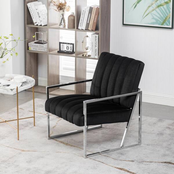 Black Accent Velvet Upholstered Vertical Striped Tufted Back Straight Arm Chairs with Silver Metal Frame