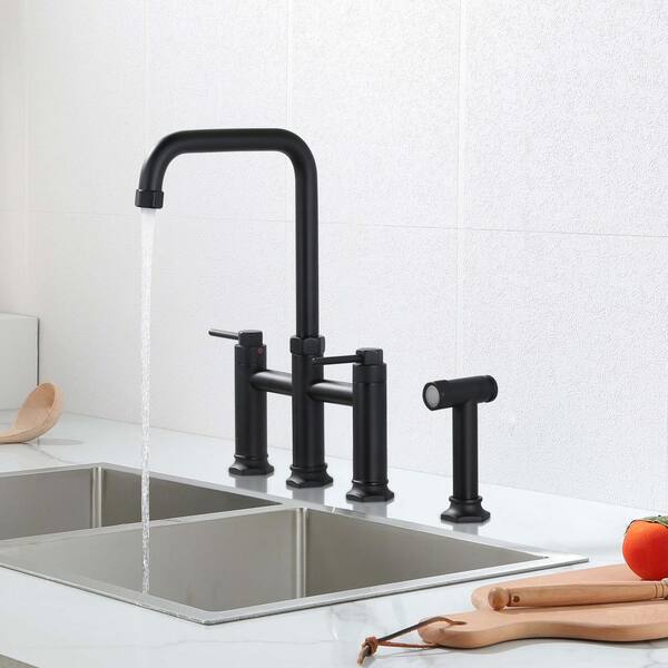 Black Double Handle High-Arc Widespread Deck Mounted Kitchen Faucet With Side Spray in Brass