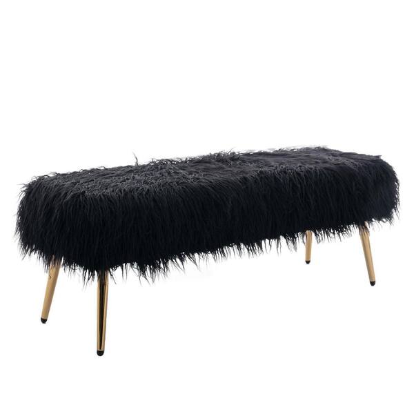 Black Faux Fur Fabric Ottoman Bench Fluffy Upholstered Bench for Bedroom Living Room 16.54 in. x 47.24 in. x 15.35 in.