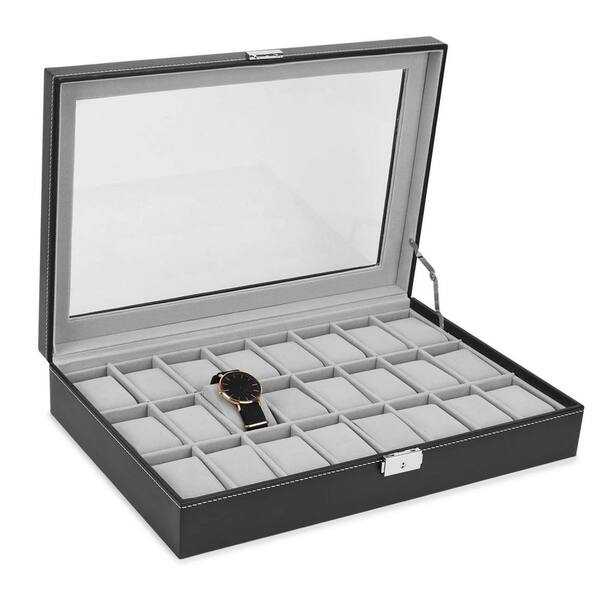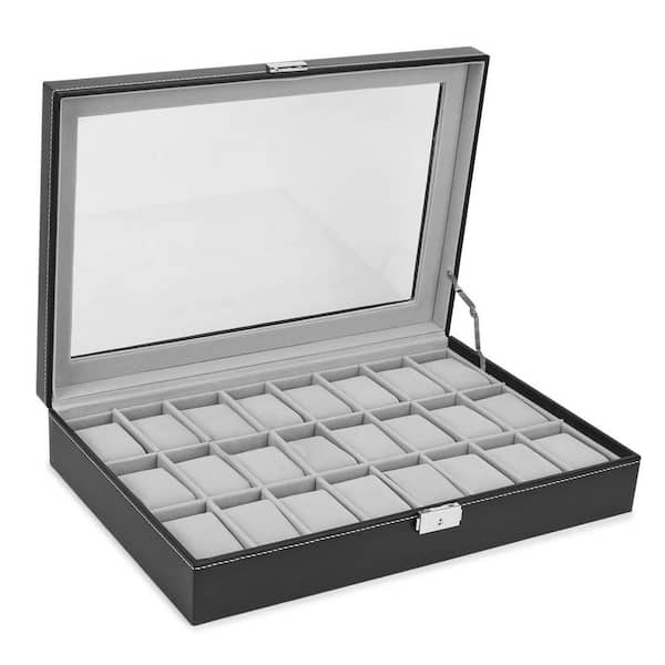 Black Faux Leather 24-Slot Lockable Watch Box with Glass Lid