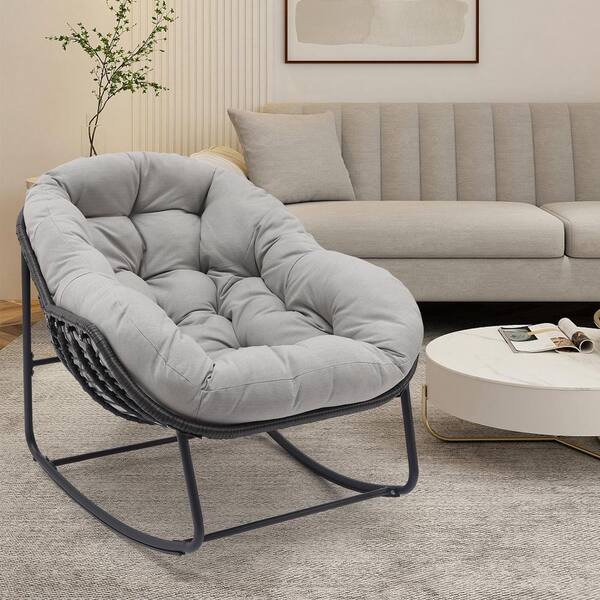 Black Indoor/Outdoor Metal Outdoor Rocking Chair Rattan Rope Club Chairs with Light Gray Cushions