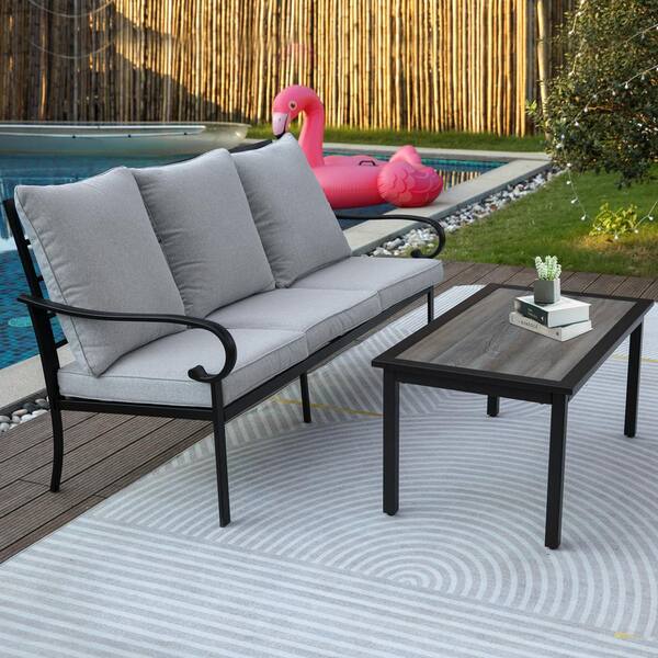 Black Iron Patio Outdoor Conversation Set, 3-Seater Sofa with Gray Cushions and Coffee Table for Porch Balcony Deck
