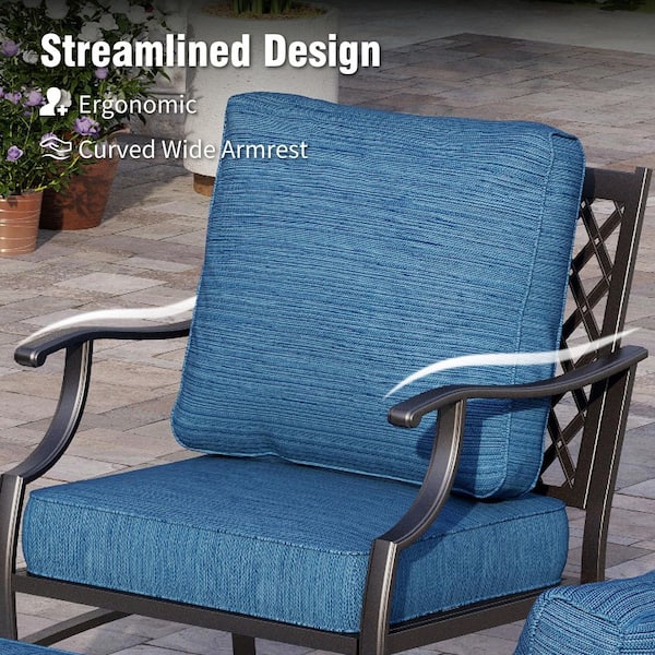 Black Meshed 7-Seat 6-Piece Metal Outdoor Patio Conversation Set with Peacock Blue Cushion Table with Marble Pattern Top