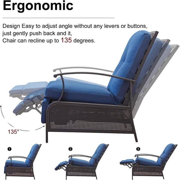 Black Metal Adjustable Outdoor Recliner with Blue Cushions, Strong Extendable Metal Frame