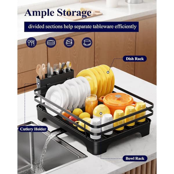 Black Metal Dish Drying Rack with Rotatable Spout and External Cutlery Holder, Rust-Resistant Kitchen Dish Rack
