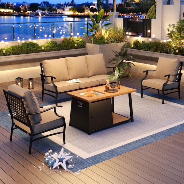 Black Metal Meshed 5 Seat 4-Piece Steel Outdoor Fire Pit Patio Set With Beige Cushions, Metal Rectangular Fire Pit Table