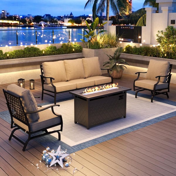 Black Metal Meshed 5 Seat 4-Piece Steel Outdoor Fire Pit Patio Set with Beige Cushions, Black Rectangular Fire Pit Table
