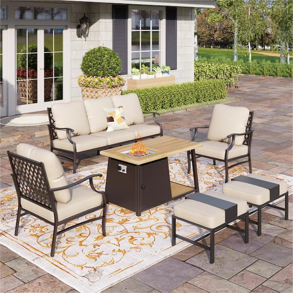 Black Metal Meshed 7 Seat 6-Piece Steel Outdoor Fire Pit Patio Set With Beige Cushions, Metal Rectangular Fire Pit Table