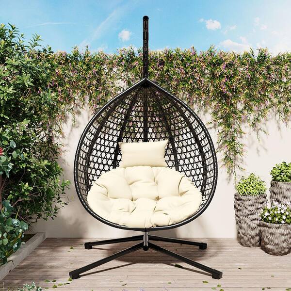 Black Metal Outdoor Rocking Chair with Beige Cushions