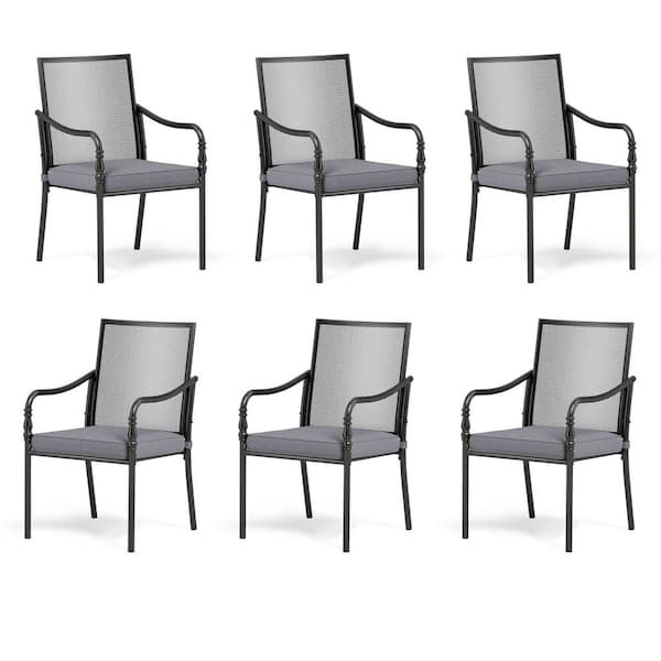 Black Metal Stylish Gourd Design Patio Outdoor Dining Chair with Gray Cushions (6-Pack)