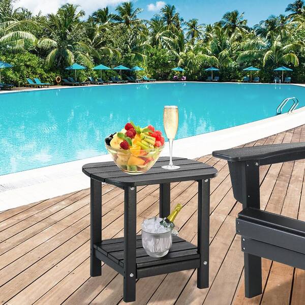 Black Oval HDPE Outdoor Side Table with Storage Shelf