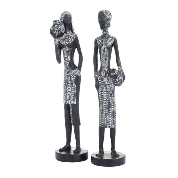 Black Polystone Standing African Woman Sculpture with Intricate Details (Set of 2)
