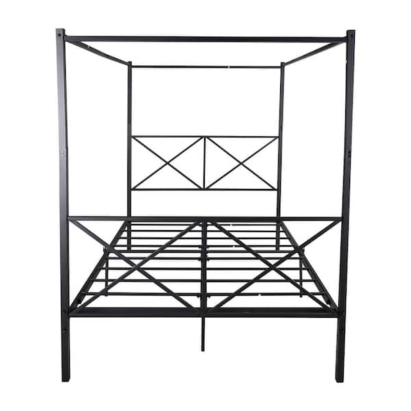 Black Queen Size 60 in. W Canopy Bed with X Shaped Headboard and Footboard, Steel Platform Bed with 4 Posters