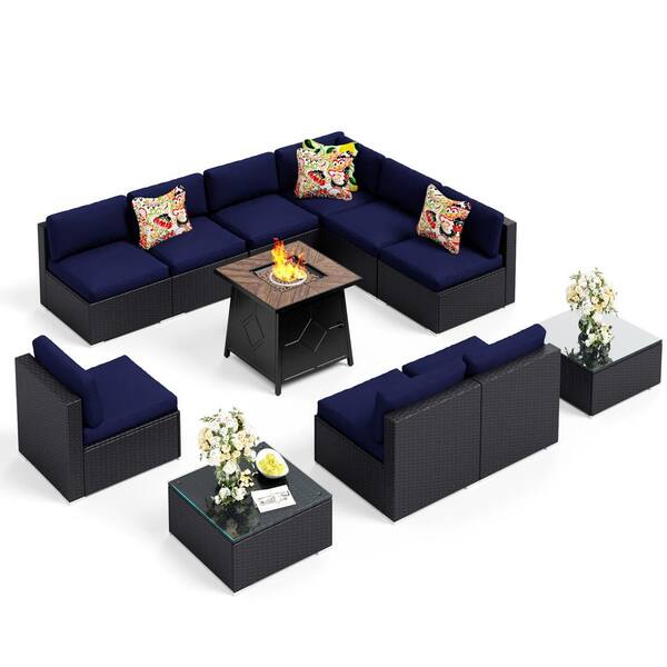Black Rattan Wicker 9 Seat 12-Piece Steel Outdoor Fire Pit Patio Set with Blue Cushions and Square Fire Pit Table