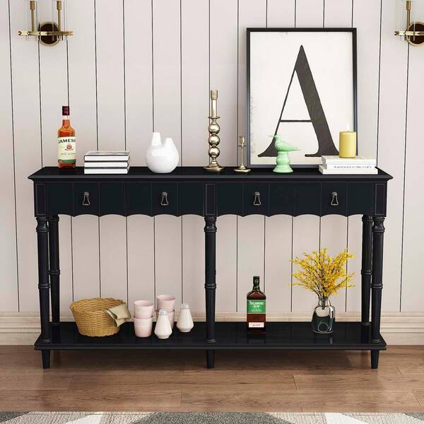 Black Rectangle Wood Top 63.00 ft. Modern Console Table Sofa Table for Living Room with 4-Drawers