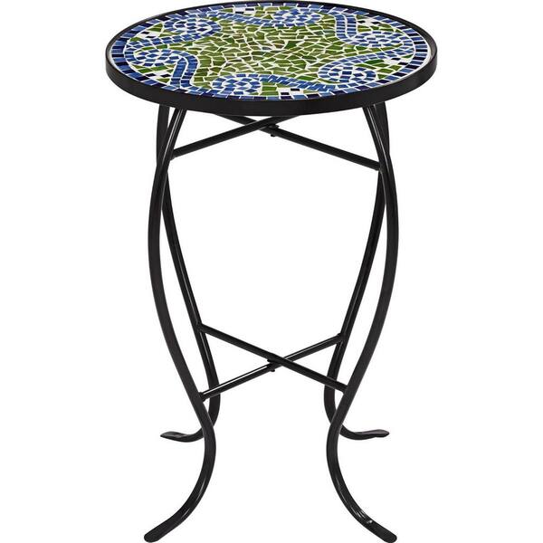 Black Round Metal Outdoor Side Table with Green Mosaic Tile Tabletop
