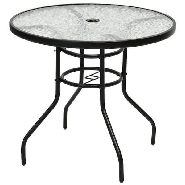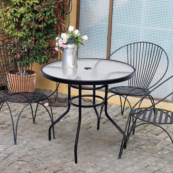 Black Round Steel Outdoor Coffee Table with Tempered Glass Top and Umbrella Hole for Backyard Lawn Balcony Pool