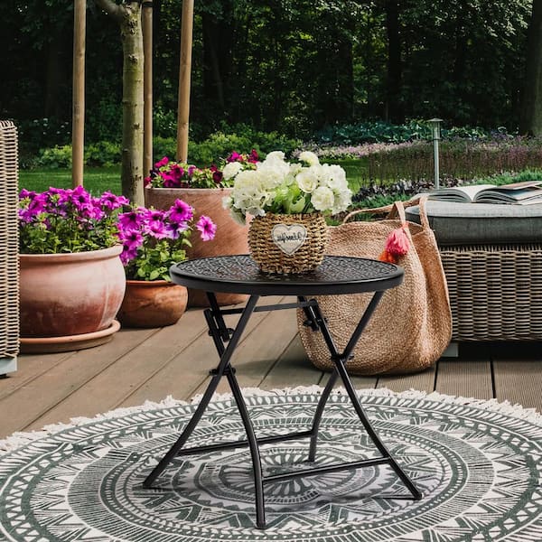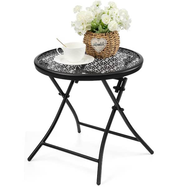 Black Round Steel Outdoor Side Table with Flower Cutouts