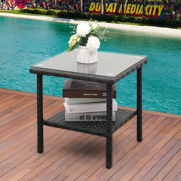 Black Square Wicker Outdoor Side Table with Glass Top for Balcony Deck Pool