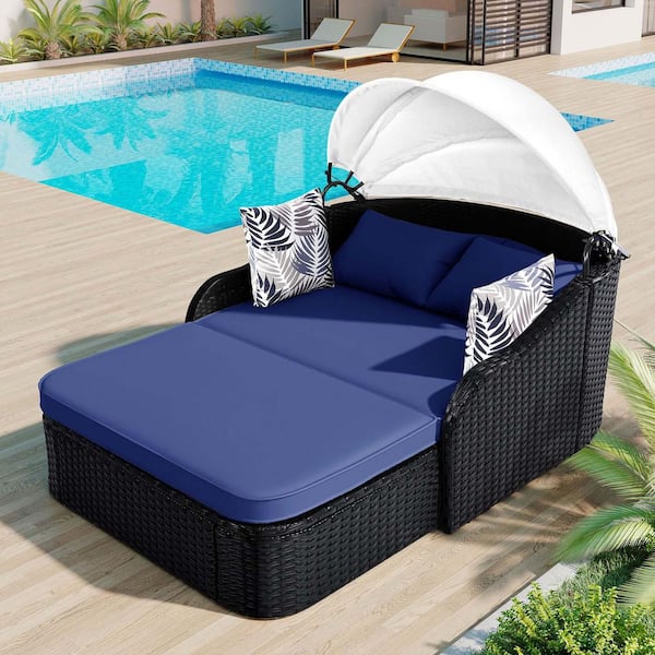 Black Wicker Outdoor Day Bed with Blue Cushions, Outdoor Sunbed with Adjustable Canopy, Double lounge, Chaise Lounge