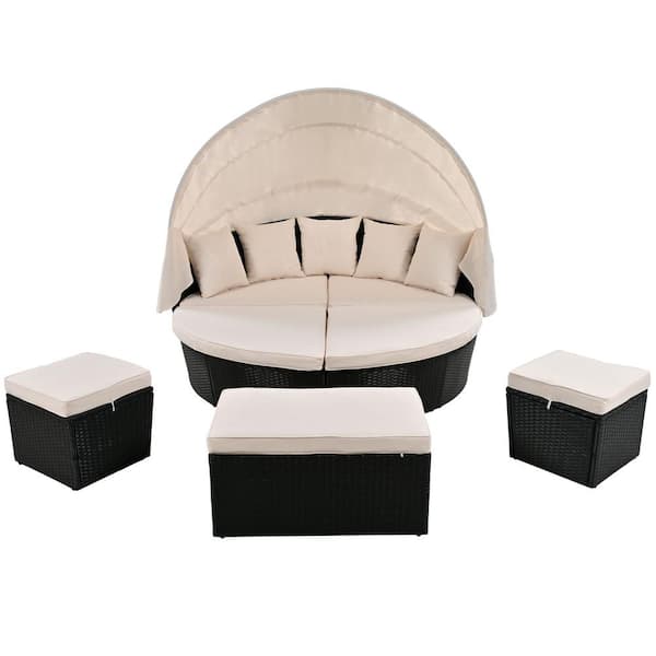 Black Wicker Outdoor Sectional Set with Washable Beige Cushions for Backyard and Porch