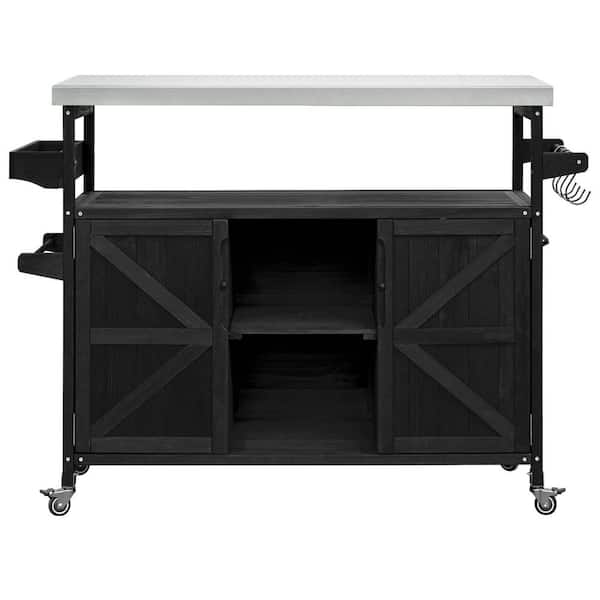 Black Wood 50.25 in. Kitchen Island with Stainless Steel Top, Spice Rack, Towel Rack, Wheels