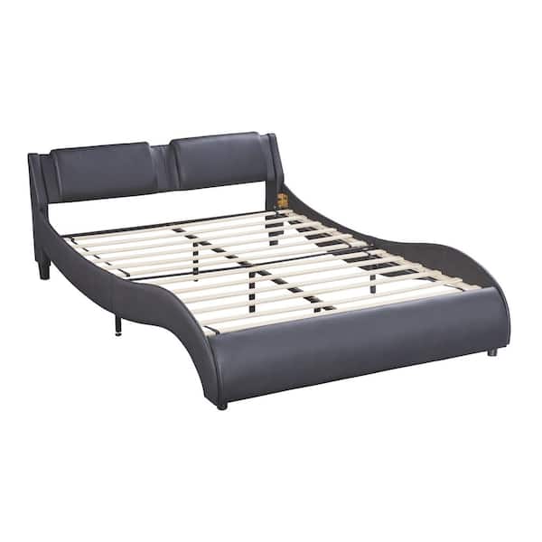 Black Wood Frame Full Size Upholstered Platform Bed with LED Lights Underneath, Faux Leather Wave Like Led Bed Frame