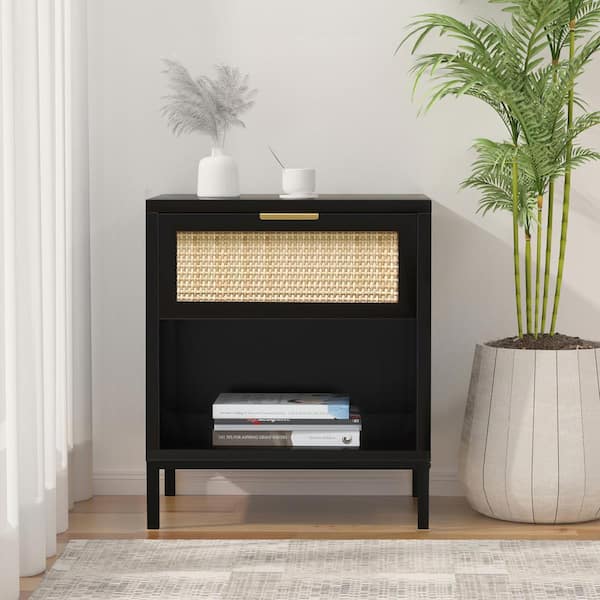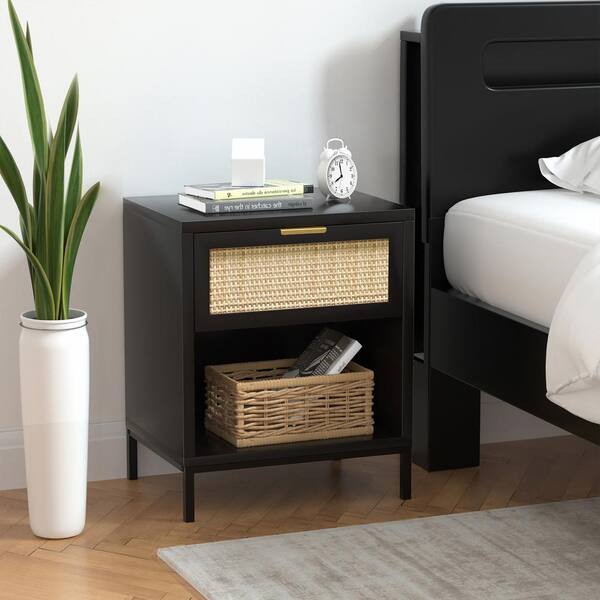 Black Wood Nightstand 18.9 in. W Natural Rattan Bedroom Living Room Side End Table with Drawer and Open Shelf