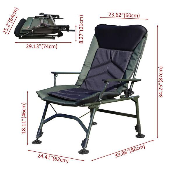 Black and Green Metal Outdoor Lounge Chair Portable Folding Reclining Camping Chair w/ Green Cushion Adjustable Backrest