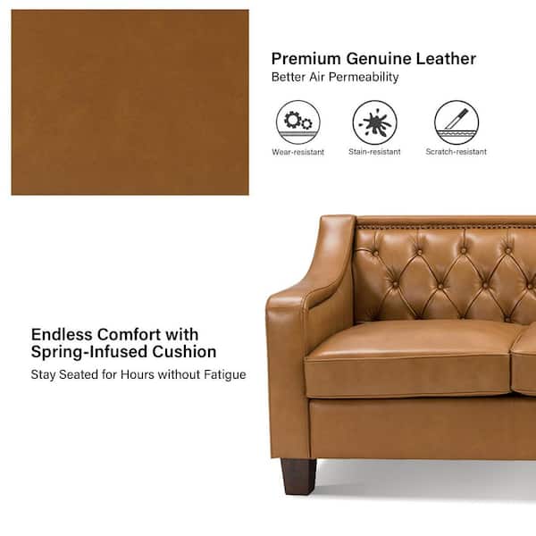 Blaz 82.28 in. Wide Slope Arms Tufted GenuineLeather 3-Seat Rectangle Camel Sofa in Brown