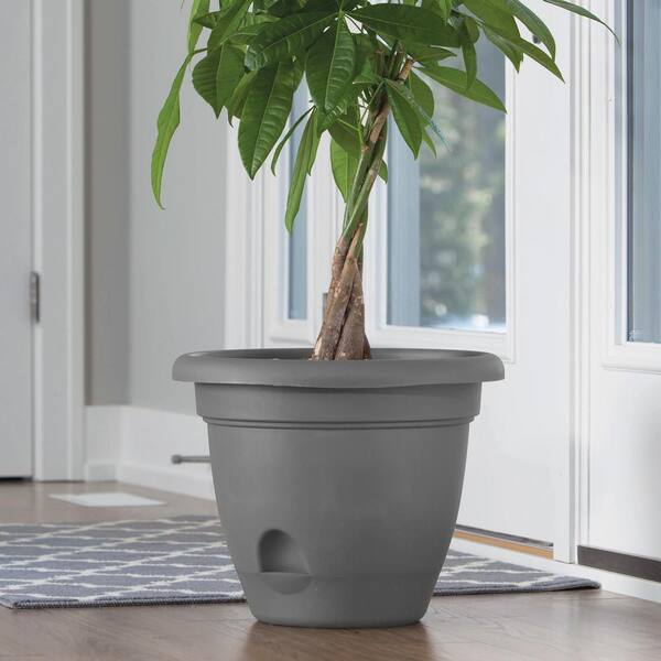 Lucca 11 in. Charcoal Plastic Self-Watering Planter with Saucer