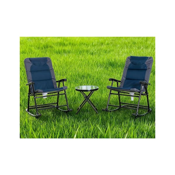 Blue 3-Piece Metal Patio Outdoor Bistro Set with Glass Coffee Table and 2-Folding Rocking Chairs with Blue Cushions