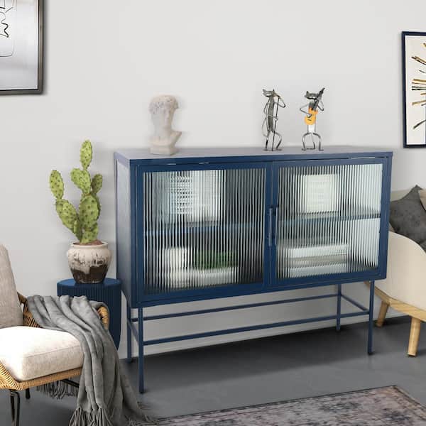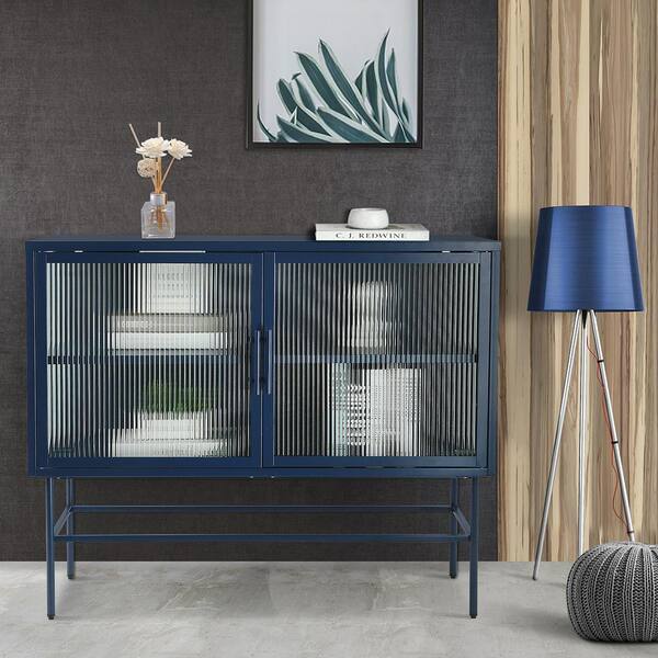 Blue Double Tampered Glass Door Pantry Organizer with Adjustable Shelf and Feet Cold-Rolled