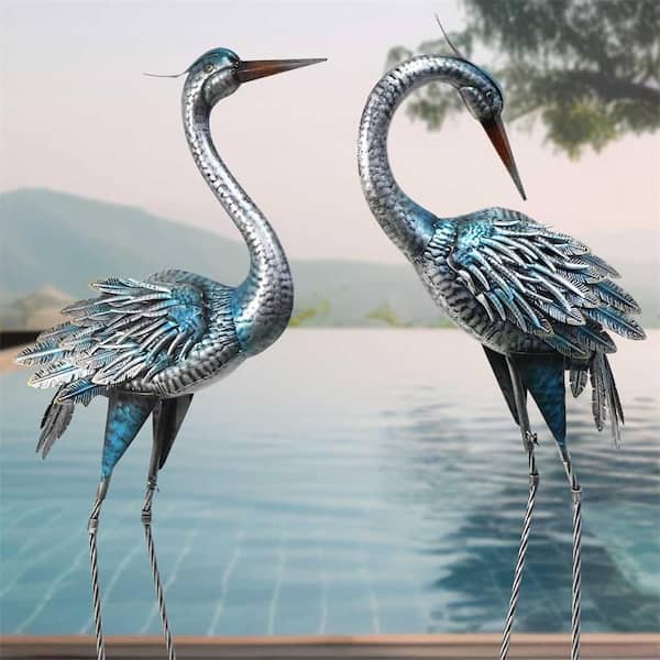 Blue Heron Garden Statues Metal Yard Art Outdoor Decoy, Garden Sculptures and Statues Pond/Outdoor Decoration (Set of 2)