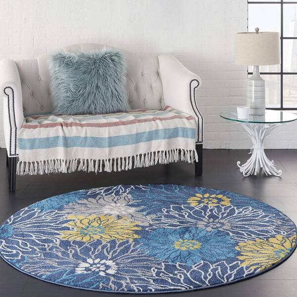 Blue Polypropylene 4 ft. x 4 ft. Floral Indoor Round Area Rug
