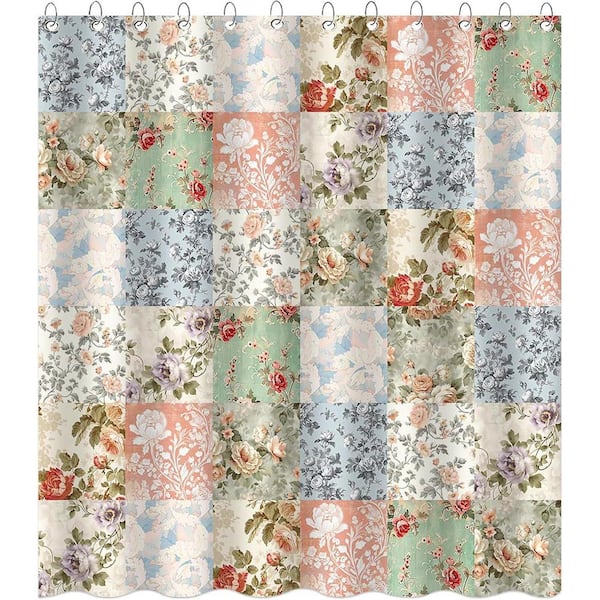 Boho Shower Curtain Floral Patchwork Bath Curtain with 12 Hooks Mid-Century Retro Decor 72 X 72 Inch Pink Microfiber