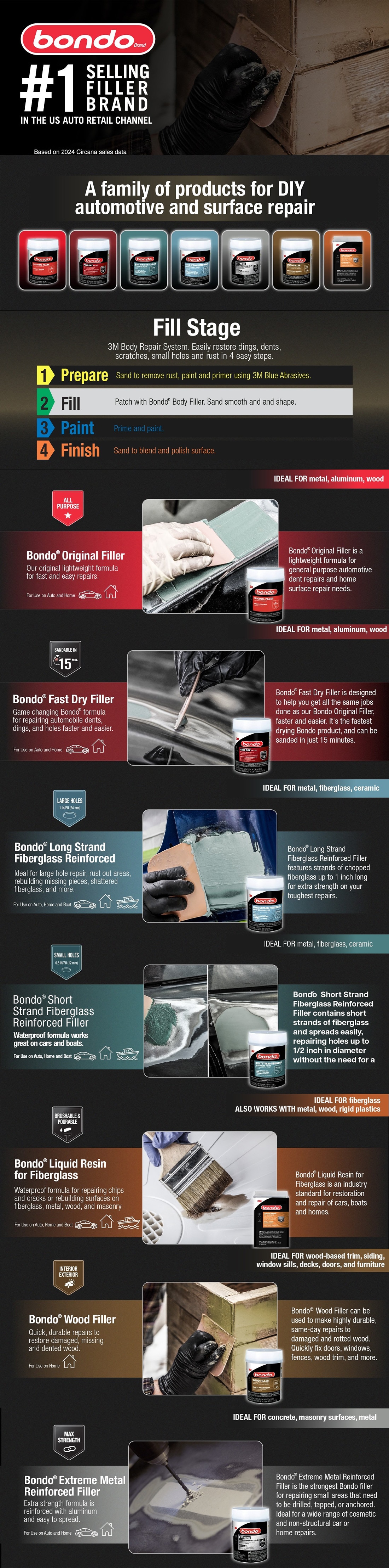 Bondo Wood Filler is a permanent, fully paintable repair material for a broad range of projects inside and outside the home. Ideal for almost any wood surface, the 2-part wood filler forms a permanent bond and will not shrink. It cures fast and can be easily sanded in as little as 15-30 minutes by hand or with power tools.