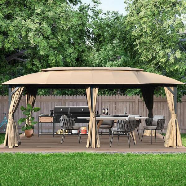 10 ft. x 20 ft. Outdoor Brown Steel Soft-top Gazebos with Fabric Ventilated Double-Roof with Curtains and Netting