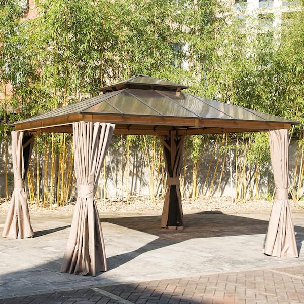 12 ft. x 16 ft. Outdoor Yellow Brown Aluminum Hardtop Gazebo with Polycarbonate Double Roof with Curtain and Netting