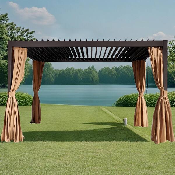 13 ft. x 10 ft. Brown Aluminum Alloy Pergola with Adjustable Roof with Netting and Curtains