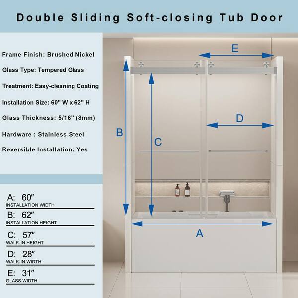 60 in. W x 62 in. H Sliding Tub Door in Nickel with Clear Tempered Glass