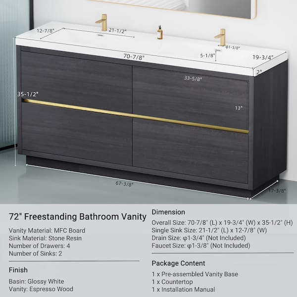 71 in. W x 20 in. D x 35 in. H Double Sink Freestanding Bath Vanity in Espresso with White Resin Top